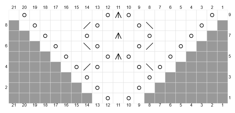 Lace patterns sometimes come with written instructions, although charts are by far the easiest way to read a lace pattern. If you struggle with reading charts, I wrote a blog post about it here. The main takeaway is to read charts from right to left on right side rows, and left to right on wrong side rows. Some lace patterns are just purled across wrong side rows, which may not be included in the chart. It is also helpful to know that some charts only show one half of what you actually knit. Traditional triangle shawls are knit from the top center down, and those charts often only include one of the two triangles you knit. Be sure to read your pattern carefully. I find it helpful to print out the charts and highlight the rows as I knit them to keep track of where I am in the pattern. Below is a simple example of a lace chart and a swatch made from that chart. Note, I purled the wrong side rows, which I did not include in the chart.