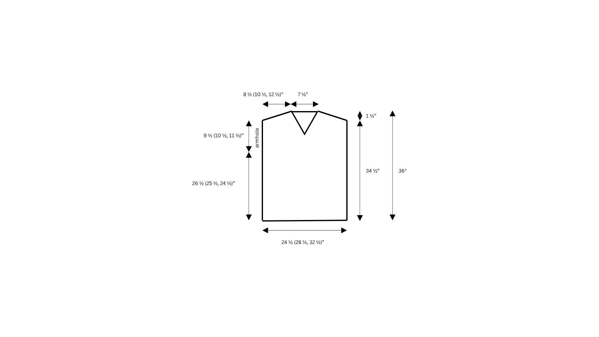 Solid lines are typically used to show the edge of a piece, usually with double-headed arrows showing the length or width for each size. These measurements might not be exactly what you get with your knitting, but the pieces should be blocked to that size. If you don’t have blocking mats with grid lines, make sure you have a ruler or tape measure on hand when blocking your knits. Sometimes arrows are included to show the direction of knitting. Dotted or dashed lines can represent either seam lines or fold lines. Each pattern that uses a schematic should have a legend explaining each element it uses, as these symbols are not a universal standard.