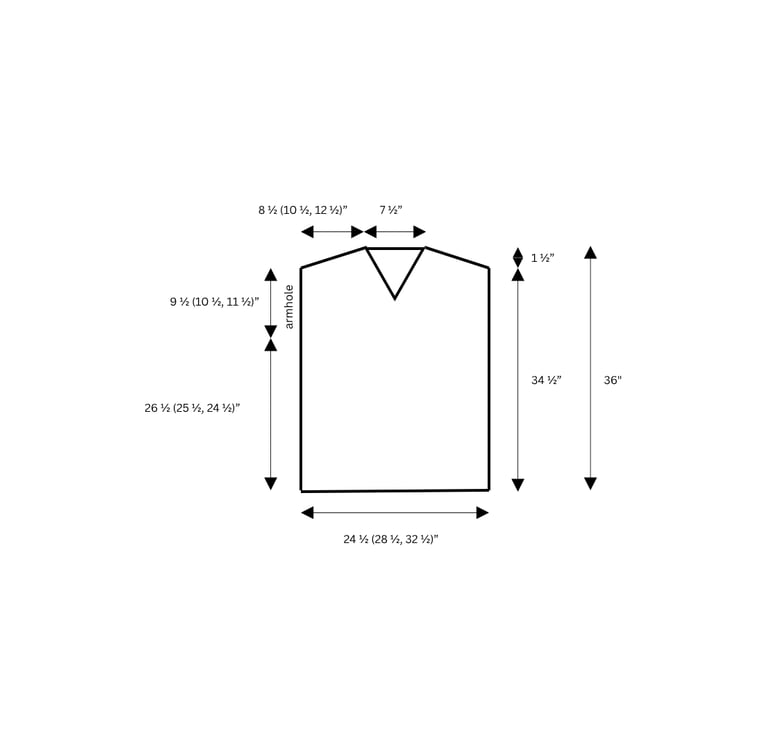 Schematics are visual representations of the finished size and shape of a knitted garment. They are often included at the end of written patterns to show the size, construction, and shape of the finished product. They typically show all measurements for each knitted piece in every size for which the pattern is written.